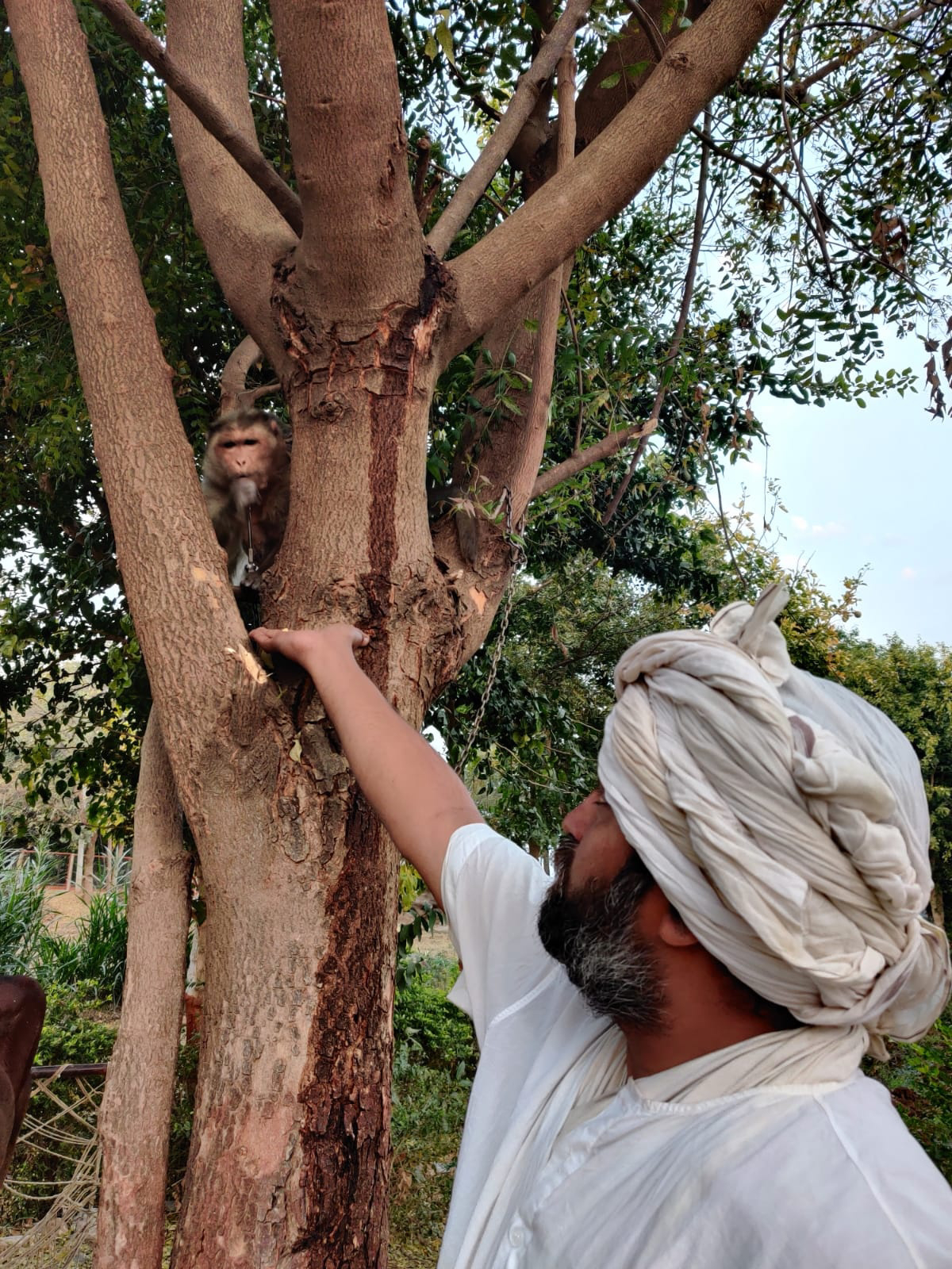 सुका मेवा दिल्यावर त्यातले फक्त काजू निवडून खाणारे कर्करग ग्रस्त 'रँचो ' माकड आणि प्रस्तुत लेखक . वरच्या खोबणीमध्ये ते बसून राहायचे . त्याने लघवी देखील तिथेच केलेली ओघळावरून दिसत आहे .